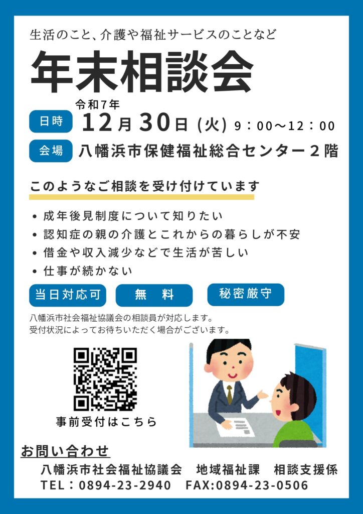 今年の年末年始は、12月27日(土)~1月4日(日)の9日間の休業となります。本会(地域福祉課 相談支援係)では、12月30日(月)9時00分~12時00分まで開所し、ご相談を受け付けます。